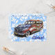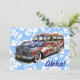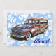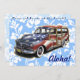 Esta ilustração original de um vagão vintage de uma estação lenhosa é combinada com um fazer americano de bandeira, este é o carro perfeito para surfar. É apresentado num pano de fundo de um impressão floral hibiscus de uma camisa vintage Aloha. Personalize este cartão para o próximo lúau, CHURRASCO, festa ou com qualquer saudação.