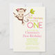 Comece-o primeira festa de aniversário fora do direito com nossos convites de festas adoráveis do aniversário de criança do macaco da menina. Aperfeiçoe o convite para você celebração do partido de primeiro aniversario! Nossos convites pequenos doces do macaco caracterizam um macaco bonito da menina que balança em um ramo de árvore e são ajustados em um fundo da listra do tan do na moda. Nosso convite de aniversário da menina do macaco caracteriza um macaco pequeno original com um chapéu do partido & balloons o fundo. Visite nossa loja para o obrigado de harmonização você cartões de nota, etiquetas do aniversário, obrigado etiquetas e selos postais. © pequeno Tatti