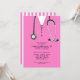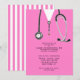 Convites criativos de formatura de enfermagem com scrubs rosa de hospital e estetoscópio. Edite o texto para criar um convite de festa de enfermagem único ou anúncio de formatura.