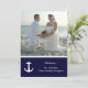 Somente recepção, após o casamento, convites temáticos tropicais ou náuticos com modelo de foto. Papelaria clássica, azul marinho e branca com texto modelo, casal de âncora branca e estrela-do-mar. Apresentando os recém-casados. Atualize o papel se desejar.