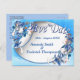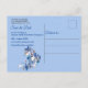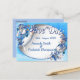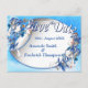Convites ilustrados com flores brancas de lua e pássaros e folhas azul-esverdeadas em um fundo azul florido, sobre uma imagem de papel enrolado criativo para personalizar. Este design moderno de papelaria é perfeito para qualquer celebração ao ar livre em um jardim de verão, como um casamento.