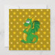 A impressão de aniversário convida com a ilustração de um dragão verde guardando um tesouro, sobre um padrão amarelo sem costura com estrelas; adequado para rapazes e raparigas
