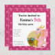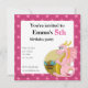 A impressão de aniversário convida as raparigas com a ilustração de um dragão cor-de-rosa a guardar um tesouro, num padrão rosa sem costura com estrelas;
