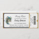 Entre num mundo de mistério e elegância com este convite de ingresso para uma festa de máscaras de luxo. Com uma máscara emplumada impressionante em tons de azul-turquesa e dourado contra um fundo dourado cintilante, este design é perfeito para um aniversário de 18 anos, Sweet 16 ou qualquer gala formal. O layout único em estilo de ingresso inclui um código de barras realista e uma aparência perfurada, fazendo com que seus convidados se sintam como se tivessem um passe VIP para um evento exclusivo. Personalize facilmente o nome, data e local para se adequar à sua celebração.