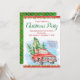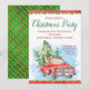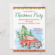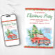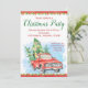 Convites de festa de Natal com caminhão vermelho antigo aquarelado e árvores de Natal em um fundo festivo de poinsettia vermelha e verde.