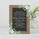 Convites de casamento modernos com vegetação verde, apresentando um fundo de madeira rústica, peça central de quadro-negro, corda, uma variedade de folhagens verdes com algumas flores brancas elegantes e um modelo de casamento clássico.