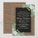 Convites de casamento modernos e frescos com vegetação, apresentando um fundo de madeira rústica, peça central de quadro-negro, corda, uma variedade de folhagens verdes com algumas flores brancas elegantes e um modelo de casamento clássico.
