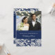 Convites elegantes para renovar fotos personalizadas em azul escuro de marinho e cor damasco floral de creme branco com texto totalmente personalizável para incluir os detalhes da sua cerimônia de renovação de promessas.