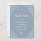 Estes elegantes convites Baptismos apresentam uma rotação moderna no deco clássico de arte. Um ornamentado, quadro geométrico branco e uma cruz decoram um adorável fundo azul empoeirado para um olhar na moda, vintage.