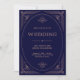 Estes convites de casamento glamourosos apresentam um spin moderno em deco de arte clássico. Uma estrutura geométrica ornamentado de ouro falso e um ornamentamento rosa decoram um elegante fundo azul de marinho escuro para um olhar dramático e casamento vintage.