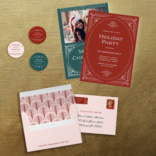 Estes elegantes convites para festas de Natal apresentam uma rotação moderna no clássico deco de arte. Um quadro geométrico ornamentado, branco e ornamentação decoram um fundo verde festivo para um visual clássico, mas glamouroso, de férias.