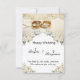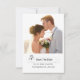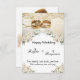 Este convite de casamento elegante oferece texto de caligrafia de varredura com uma decoração de flores moderna e uma sobreposição de foto no verso de um fundo de dois anéis de ouro.