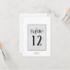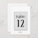 Uma fonte ousada e decorativa imediatamente pega seu olho e define o tom para a maioria das peças desta suíte de casamento moderna e minimalista. O cartão de número da mesa de casamento mostrado aqui apresenta um design refinado, preto e branco com um modelo para adicionar facilmente seus nomes e a data do casamento. Procure ID887 para ver todos os produtos neste conjunto de casamento.