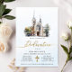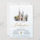 Convite para Dedicação de Cor de Água Azul, moderno e elegante. A design inclui uma ilustração aquarela de uma igreja, uma escritura elegante em ouro para a palavra "Dedicação", uma cruz de ouro, e bloqueie letras maiúsculas para a informação de celebração. Para alterar as cores e fontes, escolha editar este design para abrir mais as opções adicionais de personalização.