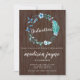 Design de cor rústica lacrimogênea para uma dedicação a bebês, com uma coroa floral azul/verde de cor d'água e um fundo de madeira escura. Todo texto está em branco e inclui dentro de "dedicação" a coroa. O inverso do convite está em pó sólido.