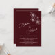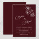 Minimalist design with white floral sketch cherry blossoms and on a deep burgundy background. Modern botanical hand drawn wedding invitation with bride and groom names in an elegant calligraphic script.