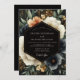 This design evokes a moody, enchanting atmosphere with its rich palette of deep navy, cream, and peachy-orange blooms. Lush botanical elements intertwine with dramatic floral arrangements, creating a sense of opulent, rustic romance.