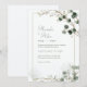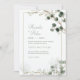 Surround your wedding details with the sophisticated and ethereal beauty of this modern deep teal and gold digital botanical arrangement. This exquisite frame features lush clusters of muted teal-blue and cream-white blossoms, accented by delicate white baby's breath sprigs and dusty sage eucalyptus leaves. A defining element is the collection of unique translucent skeleton leaves intricately veined with shimmering golden filigree. A sleek, double-line gold geometric frame anchors the composition against a clean white central background, while a soft, misty grey-blue watercolor wash creates a magical, hazy backdrop outside the border. The intricate textures and high-definition clarity provide a polished and timeless aesthetic for your special announcement. This unique botanical layout is a premier choice for a modern estate wedding or a sophisticated garden ceremony. The cool deep teal and gold color story makes it exceptionally suited for an elegant evening bridal shower, a refined engagement party, or an intimate vineyard reception. It pairs beautifully with wedding themes like modern organic, fine-art botanical, or moody romantic, and coordinates flawlessly with color palettes featuring navy blue, metallic gold, slate grey, or champagne accents.