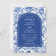 Este belo e elegante convite de casamento apresenta um antigo padrão de Chinoiserie azul. O texto combina o script manuscrito e as fontes serif para uma aparência na moda e moderna. Isto é perfeito para um casamento de primavera ou jardim de verão.