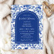 Este belo e elegante chá de panela apresenta um antigo padrão de Chinoiserie azul. O texto combina o script manuscrito e as fontes serif para uma aparência na moda e moderna. Isto é perfeito para um primavera ou chá de panela de jardim de verão.