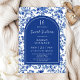 Este belo e elegante e doce convite de aniversário de dezesseis apresenta um antigo padrão de Chinoiserie azul. O texto combina o script manuscrito e as fontes serif para uma aparência na moda e moderna. Isto é perfeito para um primavera ou um jardim de verão doce 16 festas de aniversário.