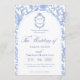 Delft blue floral wedding invitation card, designed in a refined blend of chinoiserie and French toile de Jouy style. The soft botanical illustrations frame an arched layout featuring an elegant wedding crest monogram, perfect for couples who love vintage, historic, and European-inspired aesthetics. Classic script typography pairs beautifully with the ceramic-blue palette, making this design an effortless nod to the tradition of “something blue.” Fully customizable with your names, date, and location, it’s an exquisite choice for any romantic or sophisticated wedding theme.