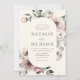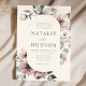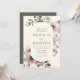 Convites florais de inverno elegantes com detalhes de seu casamento mostrados em letras verdes escuras em dentro de um quadro floral oval com fundo de marfim. As flores de inverno apresentam uma paleta colorida de rosa poeirento, rosa claro, marfim e ouro amarelo macio com folhas de eucalipto e folhagem de inverno em tons de verde sábio e verde florestal rico.