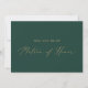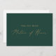 Este delicado cartão de dourado e de honra verde é perfeito para um casamento moderno. A design romântica minimalista apresenta uma magnífica e elegante tipografia amarela ouro champanhe num fundo verde esmeralda com um aspecto simples e limpo. Personalize o cartão com o nome da noiva e a matriz de honra. Personalize a parte traseira do cartão com uma mensagem personalizada.
