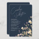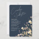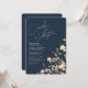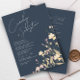 Um convite de casamento com um toque moderno. Um floral de flor silvestre com cores cor rosa suave e amarelo pálido sobre um fundo azul marinho. No verso há espaços de modelo para adicionar detalhes e código QR para seus convidados digitalizarem e RSVP em seu site. Misture e combine cores para criar uma suíte de casamento única. Excelente para primavera, verão do outono.