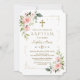 Design de cartão elegante com flores rosadas cor-de-água delicadas, cor-de-rosa pincelada, forma falsa de ouro brilhante e confete, cruz falsa de ouro, divisor floral, sobre fundo branco. Nas costas, buquê de flores e cruz sobre fundo branco. Use a ferramenta Personalizar para adicionar suas informações, alterar fontes, cores da fonte. Para obter itens correspondentes, visite minha nova coleção de celebrações Baptism/Christening.