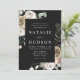 Convites florais de inverno elegantes com detalhes de seu casamento mostrados em letras verdes escuras em dentro de um quadro floral boho com fundo preto. As flores de inverno apresentam uma paleta colorida de rosa poeirento, rosa claro, marfim e ouro amarelo macio com folhas de eucalipto e folhagem de inverno em tons de verde sábio e verde florestal rico.
