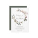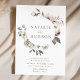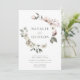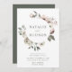 Convites florais de inverno elegantes com seus nomes cercados por uma coroa de flores e folhagem de aquarela. As flores de inverno apresentam uma paleta colorida de rosa poeirento, rosa claro, marfim e ouro amarelo macio com folhas de eucalipto e folhagem de inverno em tons de verde sábio e verde florestal rico.