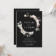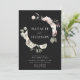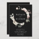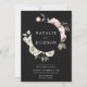 Convites florais de inverno elegantes com seus nomes cercados por uma coroa de flores de aquarela e folhagem com fundo preto. As flores de inverno apresentam uma paleta colorida de rosa poeirento, rosa claro, marfim e ouro amarelo macio com folhas de eucalipto e folhagem de inverno em tons de verde sábio e verde florestal rico.