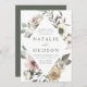 Convites florais de inverno elegantes com detalhes de seu casamento mostrados em letras verdes escuras em dentro de um quadro floral boho. As flores de inverno apresentam uma paleta colorida de rosa poeirento, rosa claro, marfim e ouro amarelo macio com folhas de eucalipto e folhagem de inverno em tons de verde sábio e verde florestal rico.