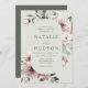 Convites florais de inverno elegantes com detalhes de seu casamento mostrados em letras verdes escuras em dentro de um quadro floral oval com um fundo verde-claro. As flores de inverno apresentam uma paleta colorida de rosa poeirento, rosa claro, marfim e ouro amarelo macio com folhas de eucalipto e folhagem de inverno em tons de verde sábio e verde florestal rico.