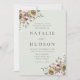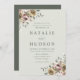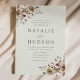 Convites florais de inverno elegantes com detalhes de seu casamento mostrados em letras verdes escuras com buquês florais nos cantos de um fundo verde sábio. As flores de inverno apresentam uma paleta colorida de rosa poeirento, rosa claro, marfim e ouro amarelo macio com folhas de eucalipto e folhagem de inverno em tons de verde sábio e verde florestal rico.