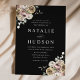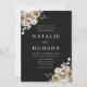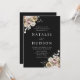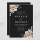 Convites florais de inverno elegantes com detalhes de casamento mostrados em letras brancas com buquês florais nos cantos de fundo preto. As flores de inverno apresentam uma paleta colorida de rosa poeirento, rosa claro, marfim e ouro amarelo macio com folhas de eucalipto e folhagem de inverno em tons de verde sábio e verde florestal rico.