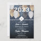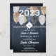 Um convite à festa de formatura moderno, elegante e chique com o tema denim e diamante que combina outro tema da moda: balões, em denim, ouro e branco com faíscas finas (esse é um efeito digital). Apresenta um fundo denim, o ano em letras negrito e tipografia em branco. Um design de "denim e diamantes" chico para uma jovem na sua formatura!