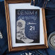Um aniversário de 21 anos moderno, elegante e chic com um tema de denim e diamantes. Ele apresenta um fundo denim, uma bota azul-denim com um rosa elegante coberto de rochas (este é um efeito digital), e tipografia em branco. Um design chic, na moda e clássico de "denim e diamantes" para uma garota fazendo vinte e um!