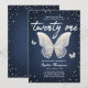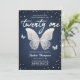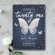 Um denim moderno, elegante e clássico, aniversário de 21 anos de diamante modelo de convite com fundo denim, a palavra vinte e um na escrita de caligrafia moderna, borboletas de rendas (este é um efeito digital, não um lugar real!) e tipografia em branco. Um convite de vinte e um anos para uma garota que ama borboletas. Um tema perfeito para uma borboleta de 21 anos.
