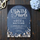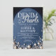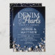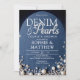 Um convite de chá moderno, elegante e chique, denim e pérolas, com tema de denim e diamantes e pérolas. Apresenta um fundo denim, elegantes rochas e pérolas (são efeitos digitais, não pedras reais ou pérolas!) letras personalizadas para a palavra "pérolas" e tipografia em branco. Um chá de casamento chic "denim, diamantes e pérolas" para um casal moderno que ama denim.