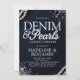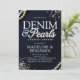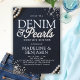 Um convite de chá moderno, elegante e chique, denim e pérolas, com tema de denim e diamantes e pérolas. Ele apresenta um fundo denim, elegantes rochas e pérolas (são efeitos digitais, não pedras reais ou pérolas!) letras personalizadas para a palavra "denim" e tipografia em branco. Um chá de casamento chic "denim, diamantes e pérolas" para um casal moderno que ama denim.