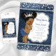 Denim e diamantes fazem convites para bebês com uma adorável menina americana étnica africana vestindo um denim fofo e uma roupa de diamante com bonito coroa de joia prateada em um belo denim e fundo de diamante. Você pode personalizar facilmente esses bonitos convites para chuveiros de bebê denim e diamante para seu evento simplesmente adicionando seus detalhes no estilo de fonte de sua escolha. Este é um design impresso sem diamantes reais, brilho, joias, denim, etc.