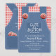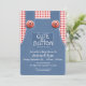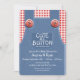 Bonito como um convite para chás de fraldas em macacões vermelho e azul, neutro em sexo, com camisa vermelha de gingham e um pirulito no bolso de trás, convite para chás de fraldas. Perfeito para temas de fazenda ou chás de fraldas de países rústicos.