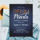 Um convite de chá moderno, elegante e chique, denim e pérolas, com tema de denim e diamantes e pérolas. Apresenta um fundo denim, uma corda de pérolas (são efeitos digitais, não pedras reais ou pérolas!), letras personalizadas para a palavra "denim", com efeito latão, e tipografia em branco. Um chá de casamento chic "denim and pearls" para um casal moderno que ama denim.