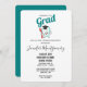 Um convite para a graduação com uma ilustração de um estilo de desenho animado, um grande dente branco sorrindo alegremente segurando uma escova de dente vermelha e dando aos polegares um sinal. O dente está vestindo um boné de formatura.
