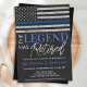 A Lenda Se Aposentou! Convites de aposentadoria da polícia de linha azul fina. Celebre anos de serviço dedicado e convide amigos e familiares para a sua festa de aposentadoria na polícia com este Convite para aposentadoria da Polícia de Sinalizador Azul Thin. DESIGN americano na Polícia de, cor da moda vintage em preto e design azul em couros falsos. Veja nossa coleção para combinar presentes de aposentadoria da polícia, favoritos para festas de aposentadoria da polícia e suprimentos. COPYRIGHT © 2021 Judy Burrows, Black Dog Art - Todos Os Direitos Reservados. Convite de festas de Sinalizador de Linha Azul Fino de Reforma de Legenda da Polícia