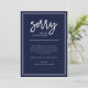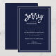 Este anúncio simples e elegante em azul-marinho é uma forma de se desculpar com os clientes ou amigos quando você precisa cancelar, remarcar ou adiar um evento ou casamento. A escrita à mão branca e moderna adiciona um toque sofisticado, enquanto a moldura retangular adiciona um visual formal e clássico. Use esses cartões de anúncio para qualquer cancelamento, adiamento ou reprogramação.