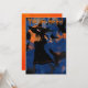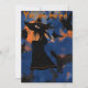 Convite de festa de Halloween de desenho animado de bruxa em vassoura voando pela noite com uma variedade de pássaros pretos e abutres. Colorido com laranja, preto e azul escuro.