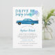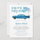 Cartão de convite para chá de fraldas, de viagem cômoda, com ilustração de um carro vintage azul com balões. O texto diz "conduzir chá de fraldas de bebê". Perfeito para o chá de um garoto enquanto você está distanciando socialmente.